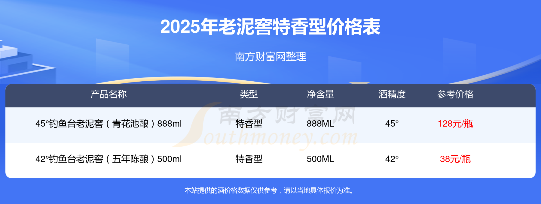 2025老泥窖特香型酒最新價格:45°釣魚臺老泥窖(青花池釀)888ml參考價128元/瓶、42°釣魚臺老泥窖(五年陳釀)500ml參考價38元/瓶。