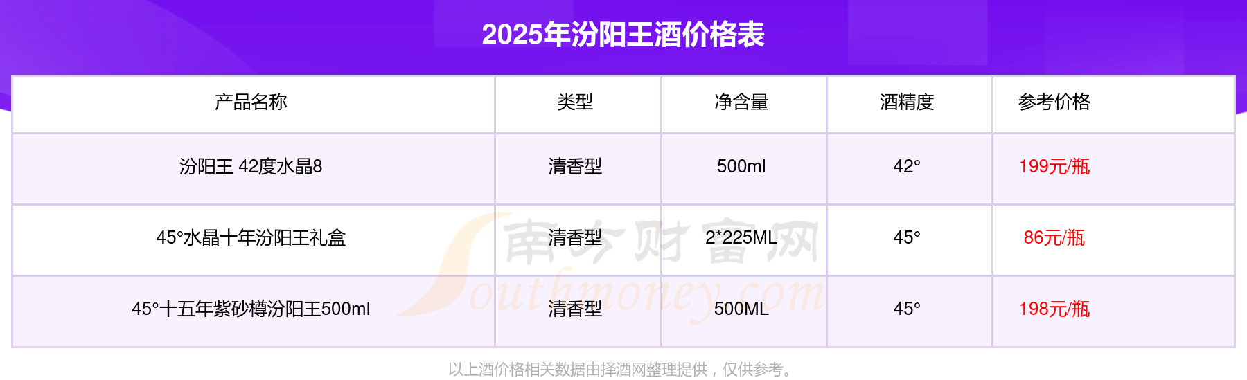 2025年,汾陽王 42度水晶8、45°十五年紫砂樽汾陽王500ml、45°水晶十年汾陽王禮盒等汾陽王酒價(jià)格如下:汾陽王 42度水晶8參考價(jià)199元/瓶、45°十五年紫砂樽汾陽王500ml參考價(jià)198元/瓶、45°水晶十年汾陽王禮盒參考價(jià)86元/瓶。