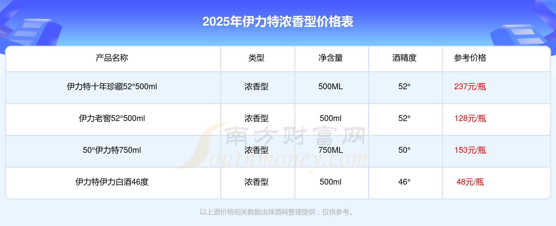 2025年,伊力特十年珍藏52°500ml、50°伊力特750ml、伊力老窖52°500ml、伊力特伊力白酒46度等伊力特濃香型酒價格如下:伊力特十年珍藏52°500ml參考價237元/瓶、50°伊力特750ml參考價153元/瓶、伊力老窖52°500ml參考價128元/瓶、伊力特伊力白酒46度參考價48元/瓶。