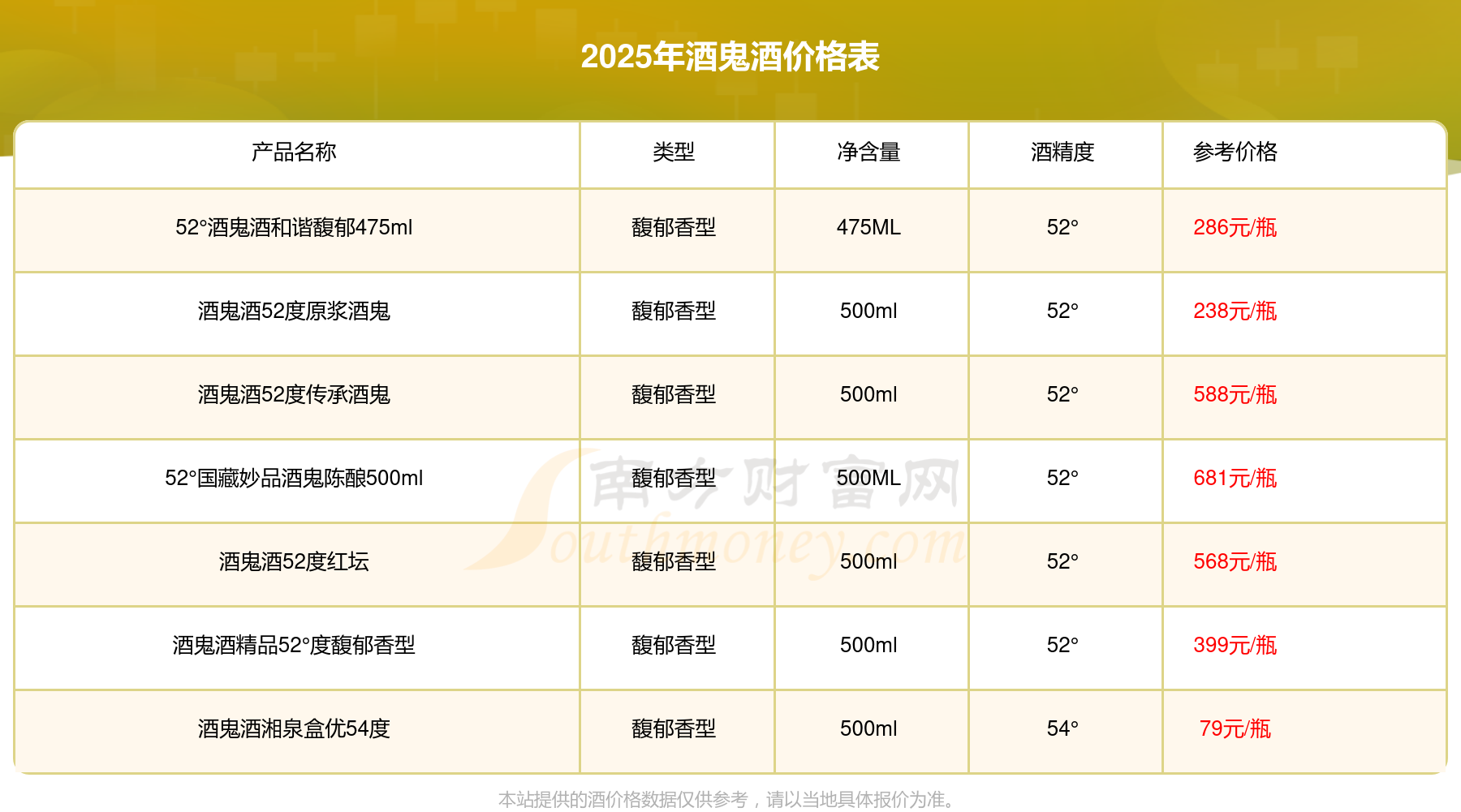 52°國藏妙品酒鬼陳釀500ml參考價681元/瓶、酒鬼酒52度傳承酒鬼參考價588元/瓶、酒鬼酒52度紅壇參考價568元/瓶、酒鬼酒精品52°度馥郁香型參考價399元/瓶、52°酒鬼酒和諧馥郁475ml參考價286元/瓶。