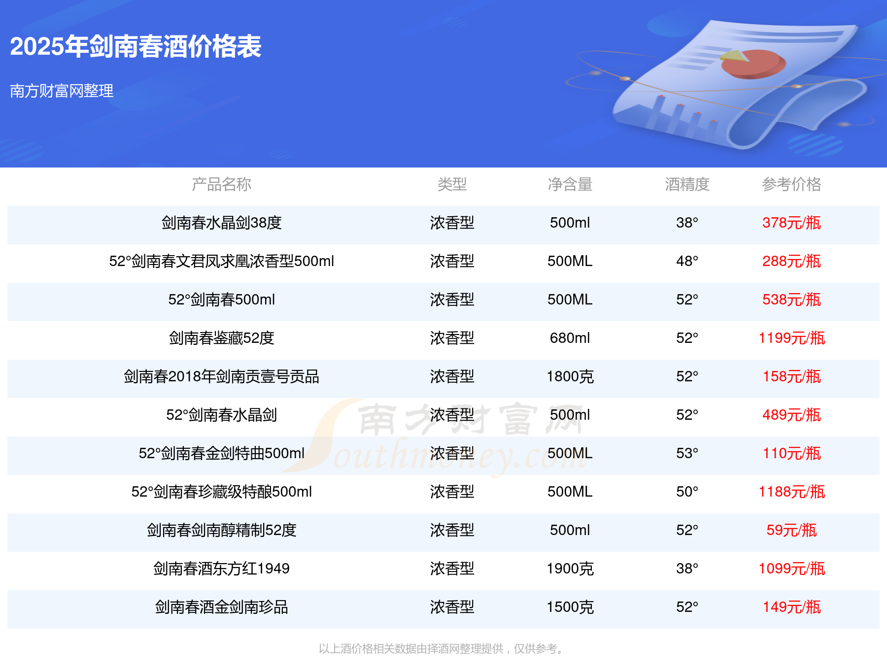 2025年,劍南春鑒藏52度、52°劍南春珍藏級(jí)特釀500ml、劍南春酒東方紅1949、52°劍南春500ml、52°劍南春水晶劍、劍南春水晶劍38度、52°劍南春文君鳳求凰濃香型500ml、劍南春2018年劍南貢壹號(hào)貢品等劍南春酒價(jià)格如下:劍南春鑒藏52度參考價(jià)1199元/瓶、52°劍南春珍藏級(jí)特釀500ml參考價(jià)1188元/瓶、劍南春酒東方紅1949參考價(jià)1099元/瓶、52°劍南春500ml參考價(jià)538元/瓶、52°劍南春水晶劍參考價(jià)489元/瓶、劍南春水晶劍38度參考價(jià)378元/瓶、52°劍南春文君鳳求凰濃香型500ml參考價(jià)288元/瓶、劍南春2018年劍南貢壹號(hào)貢品參考價(jià)158元/瓶。