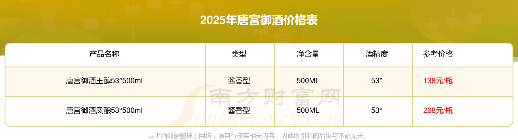 唐宮御酒最新價(jià)格2025:唐宮御酒鳳釀53°500ml參考價(jià)268元/瓶、唐宮御酒王醇53°500ml參考價(jià)138元/瓶。