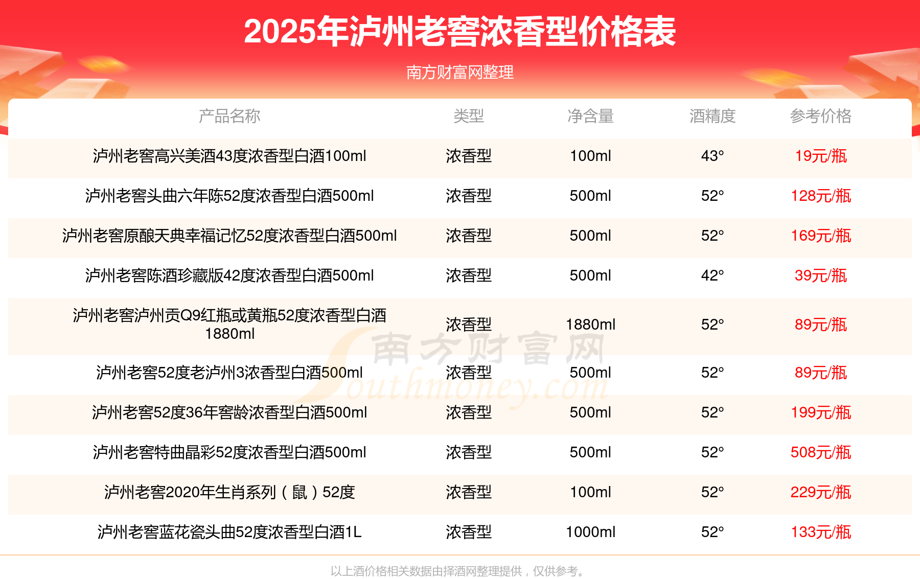 2025年,瀘州老窖國窖1573春釀鼠兆豐年E 55度、瀘州老窖國窖1573生命中的那壇酒55度014、瀘州老窖國窖1573春釀鼠兆豐年A 55度、瀘州老窖國窖1573生命中的那壇酒55度013濃香型白酒1000ml、瀘州老窖國窖1573生命中的那壇酒55度009 1000ml、瀘州老窖國窖1573中國品味52度濃香型白酒500ml、瀘州老窖國窖1573許燎源概念作品58度濃香型白酒1000ml等瀘州老窖濃香型酒價格如下:瀘州老窖國窖1573春釀鼠兆豐年E 55度參考價17999元/瓶、瀘州老窖國窖1573生命中的那壇酒55度014參考價9999元/瓶、瀘州老窖國窖1573春釀鼠兆豐年A 55度參考價5088元/瓶、瀘州老窖國窖1573生命中的那壇酒55度013濃香型白酒1000ml參考價4988元/瓶、瀘州老窖國窖1573生命中的那壇酒55度009 1000ml參考價4288元/瓶、瀘州老窖國窖1573中國品味52度濃香型白酒500ml參考價2888元/瓶、瀘州老窖國窖1573許燎源概念作品58度濃香型白酒1000ml參考價2680元/瓶。