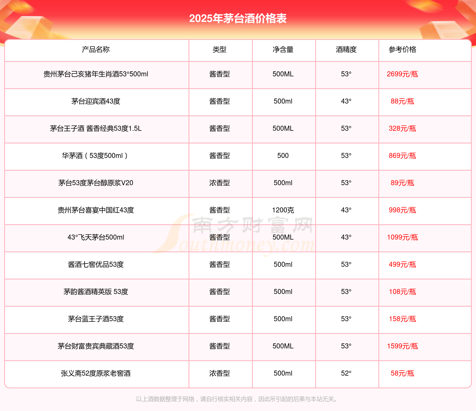 華茅鑒藏 醬香型白酒 3L 53°參考價8388元/瓶、53度五星茅臺生肖酒丁酉雞年參考價2798元/瓶、貴州茅臺己亥豬年生肖酒53°500ml參考價2699元/瓶、53度五星茅臺生肖酒戊戌狗年參考價2698元/瓶、飛天茅臺53°500ml(2015年)參考價2199元/瓶、茅臺王子酒己亥豬年生肖紀念酒53度2.5L參考價2099元/瓶、茅臺1935醬香型53度參考價1799元/瓶、茅臺財富貴賓典藏酒53度參考價1599元/瓶。