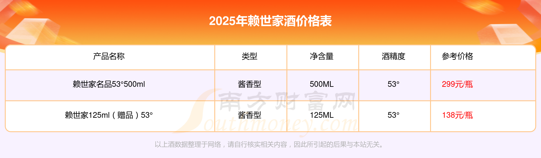 2025年,賴世家名品53°500ml、賴世家125ml(贈品)53°等賴世家酒價格如下: