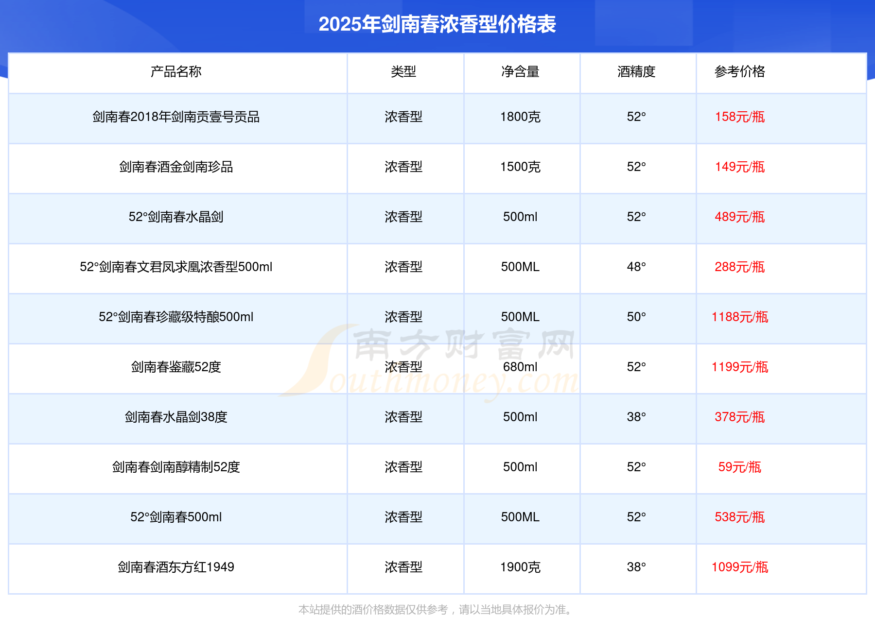 2025年劍南春濃香型酒劍南春鑒藏52度、52°劍南春珍藏級特釀500ml、劍南春酒東方紅1949、52°劍南春500ml、52°劍南春水晶劍、劍南春水晶劍38度等最新價(jià)格如下:劍南春鑒藏52度參考價(jià)1199元/瓶、52°劍南春珍藏級特釀500ml參考價(jià)1188元/瓶、劍南春酒東方紅1949參考價(jià)1099元/瓶、52°劍南春500ml參考價(jià)538元/瓶、52°劍南春水晶劍參考價(jià)489元/瓶、劍南春水晶劍38度參考價(jià)378元/瓶。
