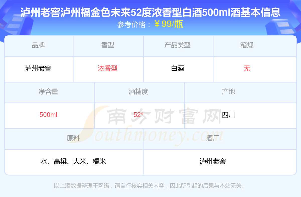 瀘州老窖瀘州福金色未來52度濃香型白酒500ml基本信息