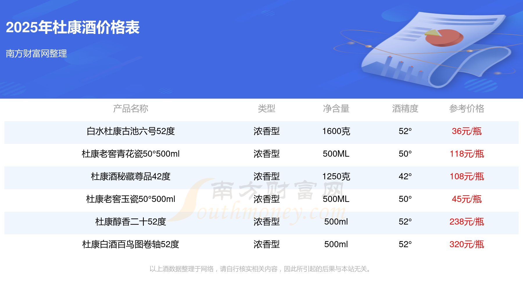 杜康白酒百鳥圖卷軸52度參考價320元/瓶、杜康醇香二十52度參考價238元/瓶、杜康老窖青花瓷50°500ml參考價118元/瓶、杜康酒秘藏尊品42度參考價108元/瓶、杜康老窖玉瓷50°500ml參考價45元/瓶。