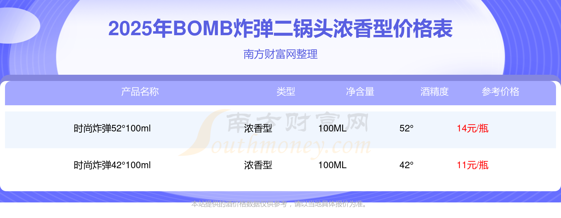 2025BOMB炸彈二鍋頭濃香型酒最新價(jià)格:時(shí)尚炸彈52°100ml參考價(jià)14元/瓶、時(shí)尚炸彈42°100ml參考價(jià)11元/瓶。