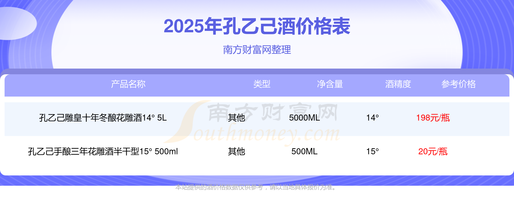 孔乙己雕皇十年冬釀花雕酒14° 5L參考價198元/瓶、孔乙己手釀三年花雕酒半干型15° 500ml參考價20元/瓶。