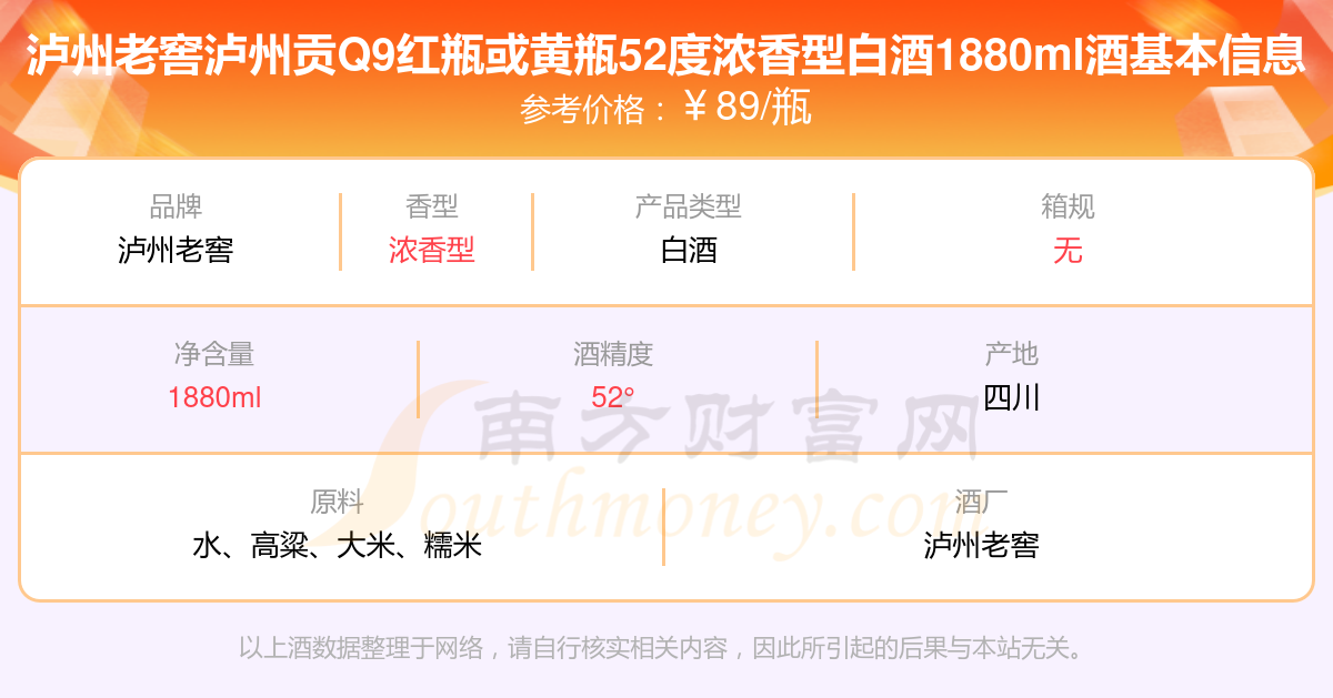 瀘州老窖瀘州貢Q9紅瓶或黃瓶52度濃香型白酒1880ml基本信息
