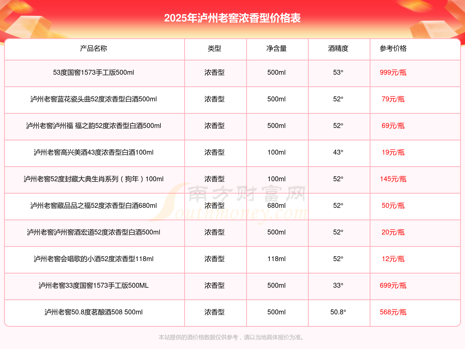 瀘州老窖濃香型酒最新價格2025:瀘州老窖國窖1573春釀鼠兆豐年E 55度參考價17999元/瓶、瀘州老窖國窖1573生命中的那壇酒55度014參考價9999元/瓶、瀘州老窖國窖1573春釀鼠兆豐年A 55度參考價5088元/瓶、瀘州老窖國窖1573生命中的那壇酒55度013濃香型白酒1000ml參考價4988元/瓶、瀘州老窖國窖1573生命中的那壇酒55度009 1000ml參考價4288元/瓶。