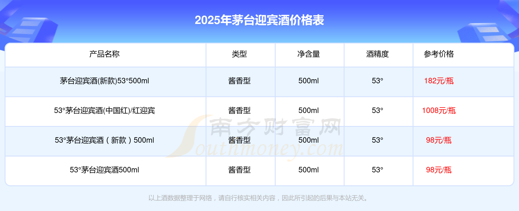 2025年,茅臺(tái)迎賓酒價(jià)格最高的是53°茅臺(tái)迎賓酒(中國(guó)紅)/紅迎賓,參考價(jià)1008元,最低的是53°茅臺(tái)迎賓酒500ml,參考價(jià)98元,價(jià)格高低差為910元。