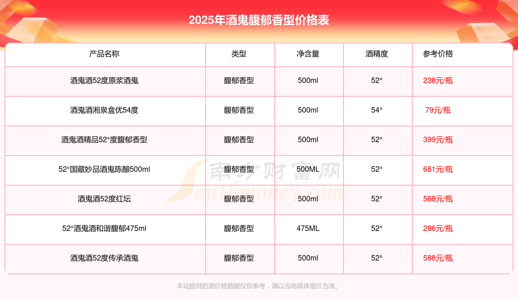 2025年酒鬼馥郁香型酒52°國(guó)藏妙品酒鬼陳釀500ml、酒鬼酒52度傳承酒鬼、酒鬼酒52度紅壇、酒鬼酒精品52°度馥郁香型、52°酒鬼酒和諧馥郁475ml、酒鬼酒52度原漿酒鬼、酒鬼酒湘泉盒優(yōu)54度等最新價(jià)格如下: