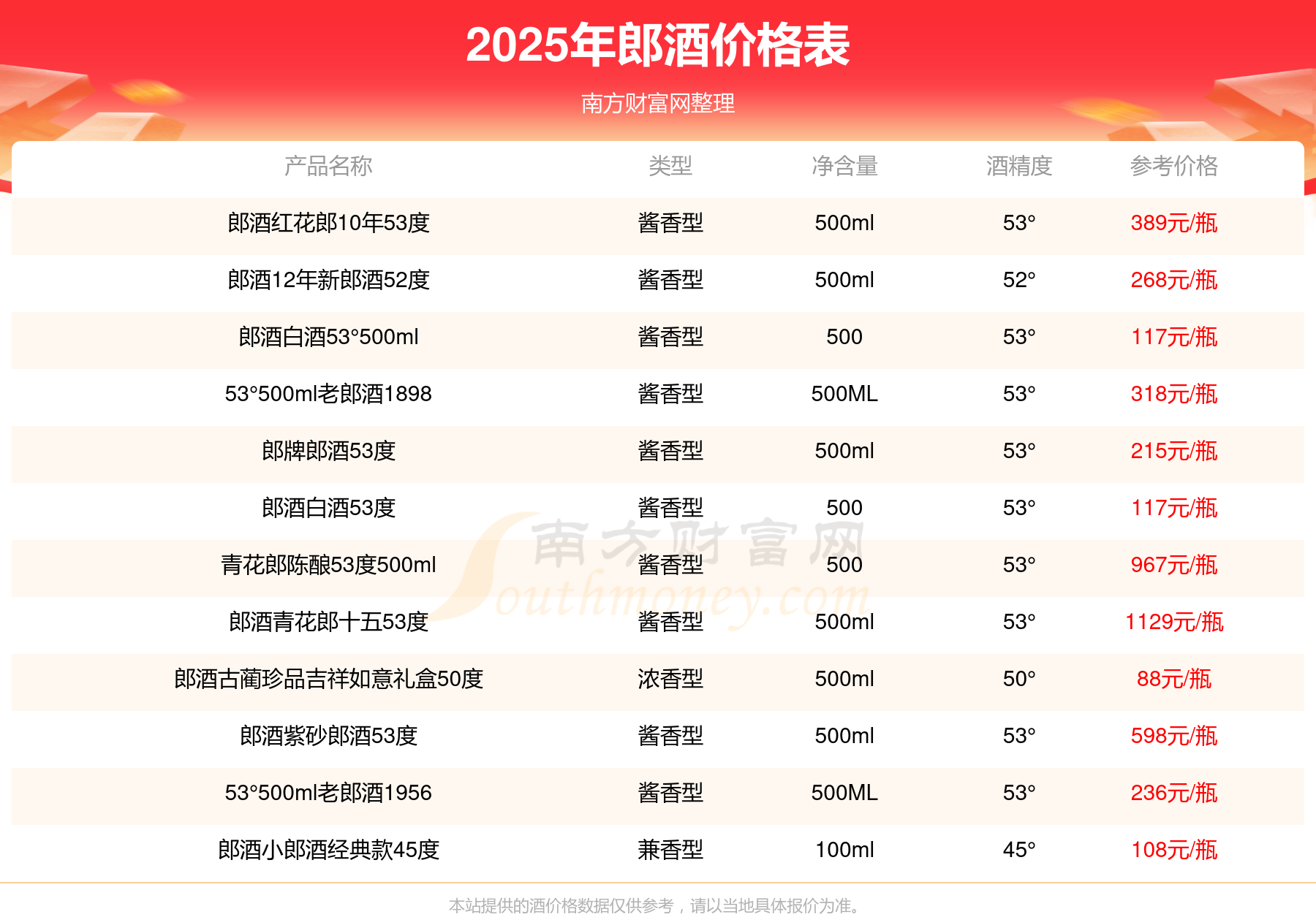 郎酒青花郎十五53度參考價(jià)1129元/瓶、青花郎陳釀53度500ml參考價(jià)967元/瓶、郎酒紫砂郎酒53度參考價(jià)598元/瓶、郎酒紅花郎10年53度參考價(jià)389元/瓶、53°500ml老郎酒1898參考價(jià)318元/瓶、郎酒12年新郎酒52度參考價(jià)268元/瓶、53°500ml老郎酒1956參考價(jià)236元/瓶。