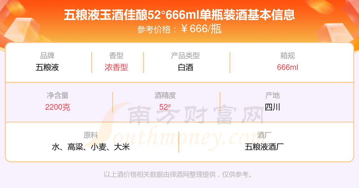 五糧液玉酒佳釀52°666ml單瓶裝基本信息