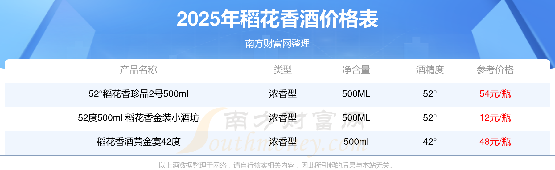 52°稻花香珍品2號500ml參考價54元/瓶、稻花香酒黃金宴42度參考價48元/瓶、52度500ml 稻花香金裝小酒坊參考價12元/瓶。