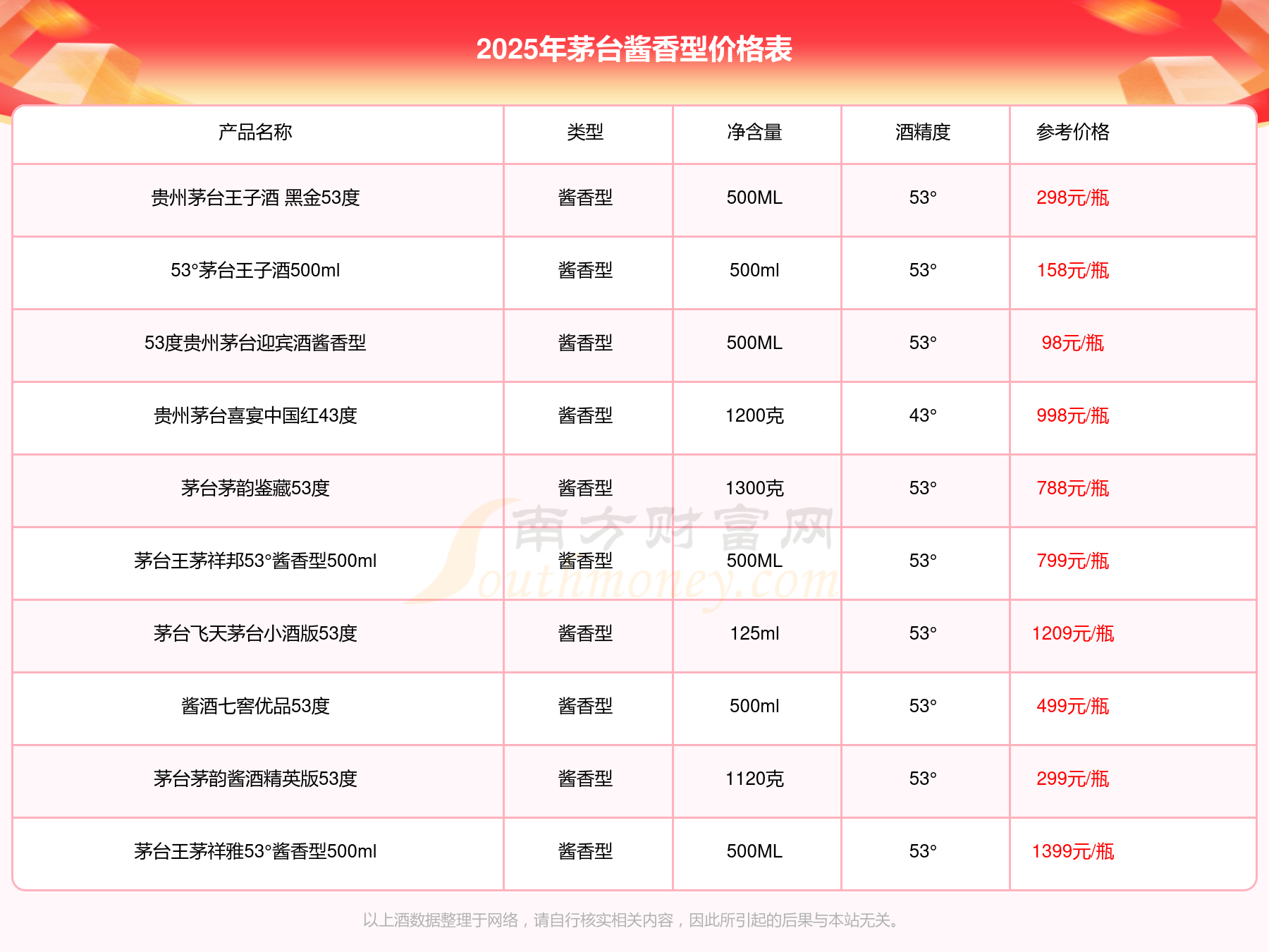 2025年茅臺醬香型酒華茅鑒藏 醬香型白酒 3L 53°、53度五星茅臺生肖酒丁酉雞年、貴州茅臺己亥豬年生肖酒53°500ml等最新價格如下: