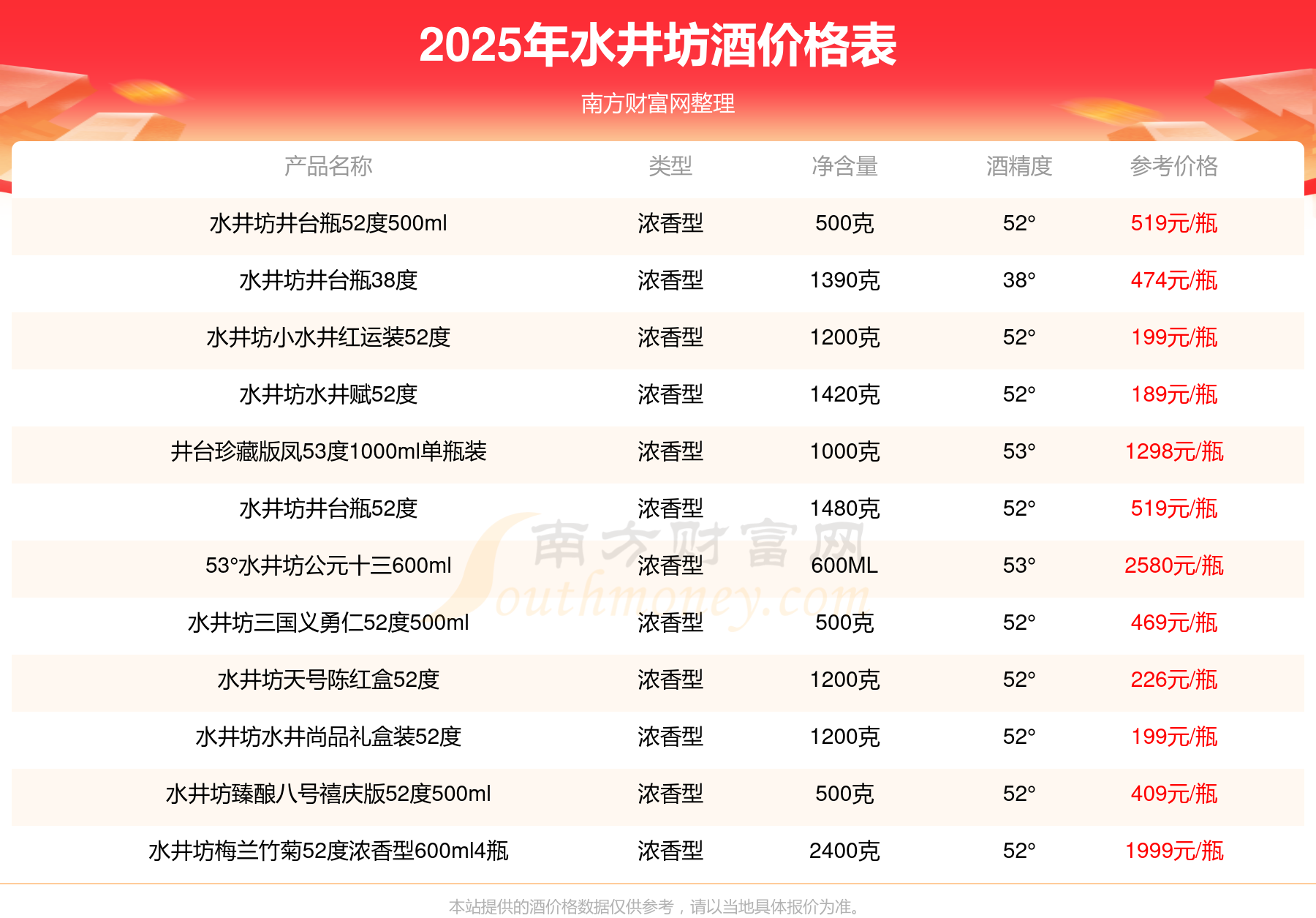 2025水井坊酒最新價(jià)格:水井坊大壇收藏級原漿天球瓶66度參考價(jià)13999元/瓶、水井坊博物館壹號53度雙瓶裝參考價(jià)10988元/瓶、53°水井坊公元十三600ml參考價(jià)2580元/瓶。