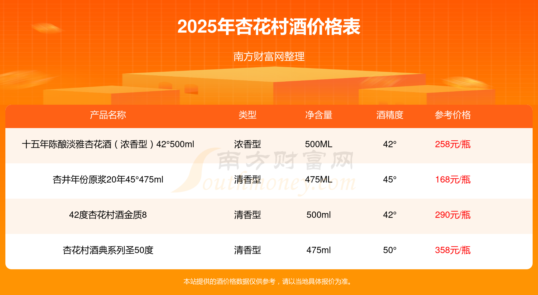 杏花村酒典系列圣50度參考價(jià)358元/瓶、42度杏花村酒金質(zhì)8參考價(jià)290元/瓶、十五年陳釀淡雅杏花酒(濃香型)42°500ml參考價(jià)258元/瓶、杏井年份原漿20年45°475ml參考價(jià)168元/瓶。