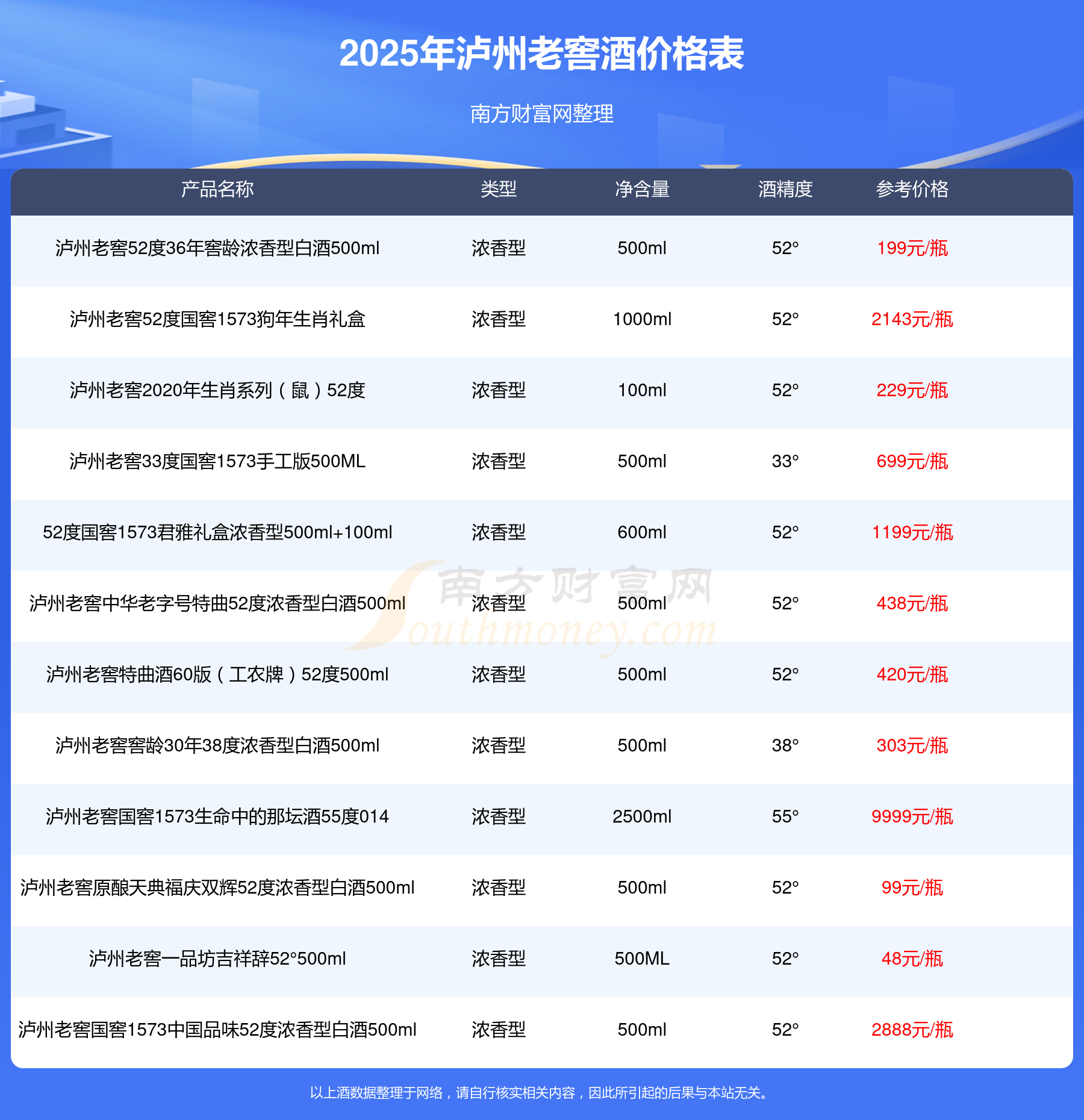 2025年,瀘州老窖國窖1573春釀鼠兆豐年E 55度、瀘州老窖國窖1573生命中的那壇酒55度014、瀘州老窖國窖1573春釀鼠兆豐年A 55度、瀘州老窖國窖1573生命中的那壇酒55度013濃香型白酒1000ml、瀘州老窖國窖1573生命中的那壇酒55度009 1000ml、瀘州老窖國窖1573中國品味52度濃香型白酒500ml、瀘州老窖國窖1573許燎源概念作品58度濃香型白酒1000ml、瀘州老窖52度國窖1573狗年生肖禮盒等瀘州老窖酒價格如下:瀘州老窖國窖1573春釀鼠兆豐年E 55度參考價17999元/瓶、瀘州老窖國窖1573生命中的那壇酒55度014參考價9999元/瓶、瀘州老窖國窖1573春釀鼠兆豐年A 55度參考價5088元/瓶、瀘州老窖國窖1573生命中的那壇酒55度013濃香型白酒1000ml參考價4988元/瓶、瀘州老窖國窖1573生命中的那壇酒55度009 1000ml參考價4288元/瓶、瀘州老窖國窖1573中國品味52度濃香型白酒500ml參考價2888元/瓶、瀘州老窖國窖1573許燎源概念作品58度濃香型白酒1000ml參考價2680元/瓶、瀘州老窖52度國窖1573狗年生肖禮盒參考價2143元/瓶。