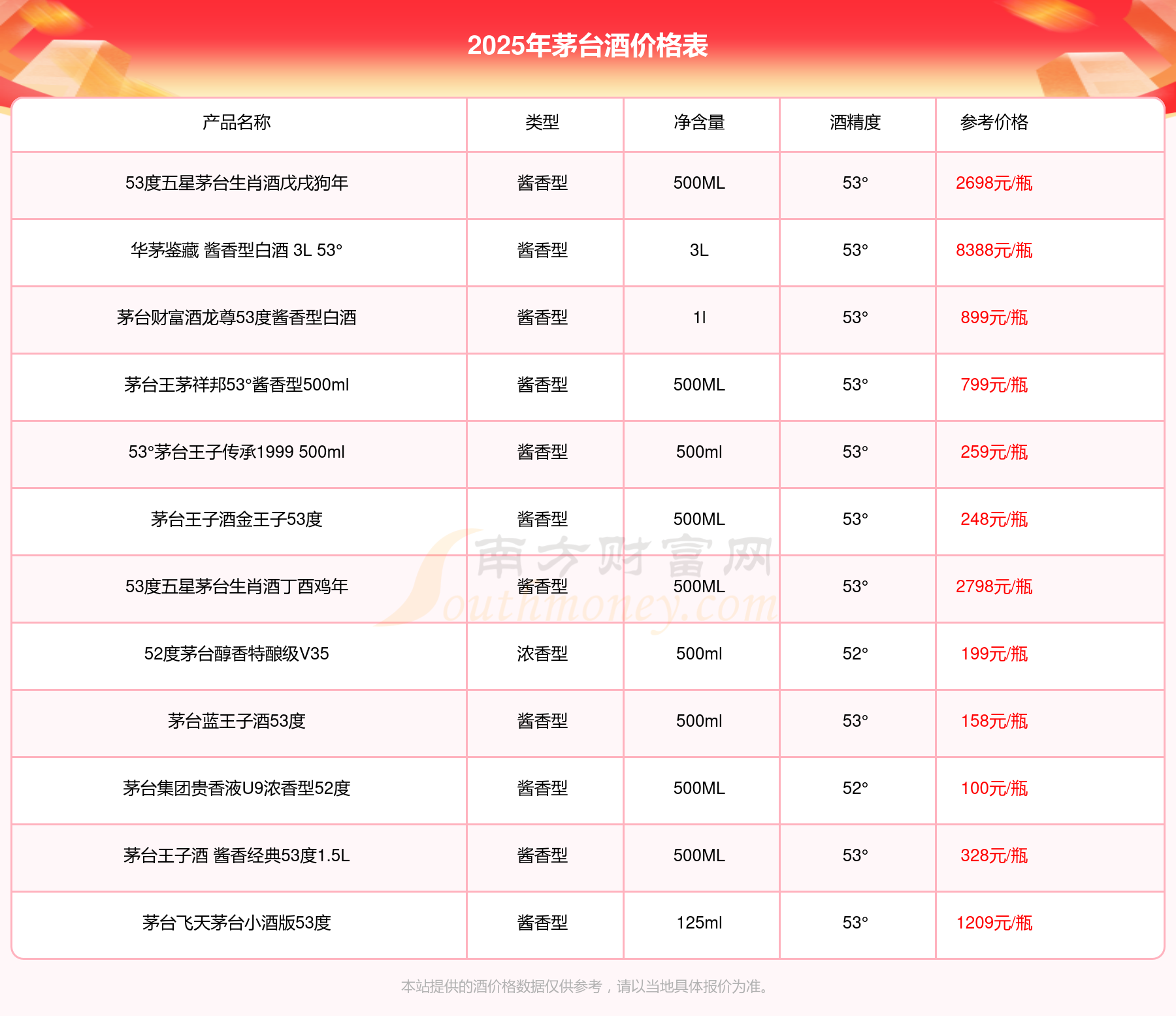 2025年茅臺(tái)酒華茅鑒藏 醬香型白酒 3L 53°、53度五星茅臺(tái)生肖酒丁酉雞年、貴州茅臺(tái)己亥豬年生肖酒53°500ml等最新價(jià)格如下: