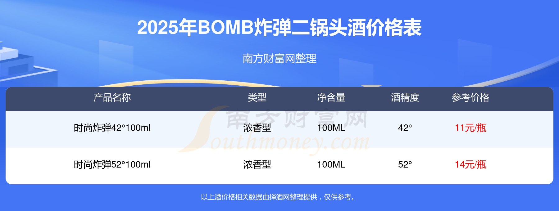 BOMB炸彈二鍋頭酒最新價格2025:時尚炸彈52°100ml參考價14元/瓶、時尚炸彈42°100ml參考價11元/瓶。
