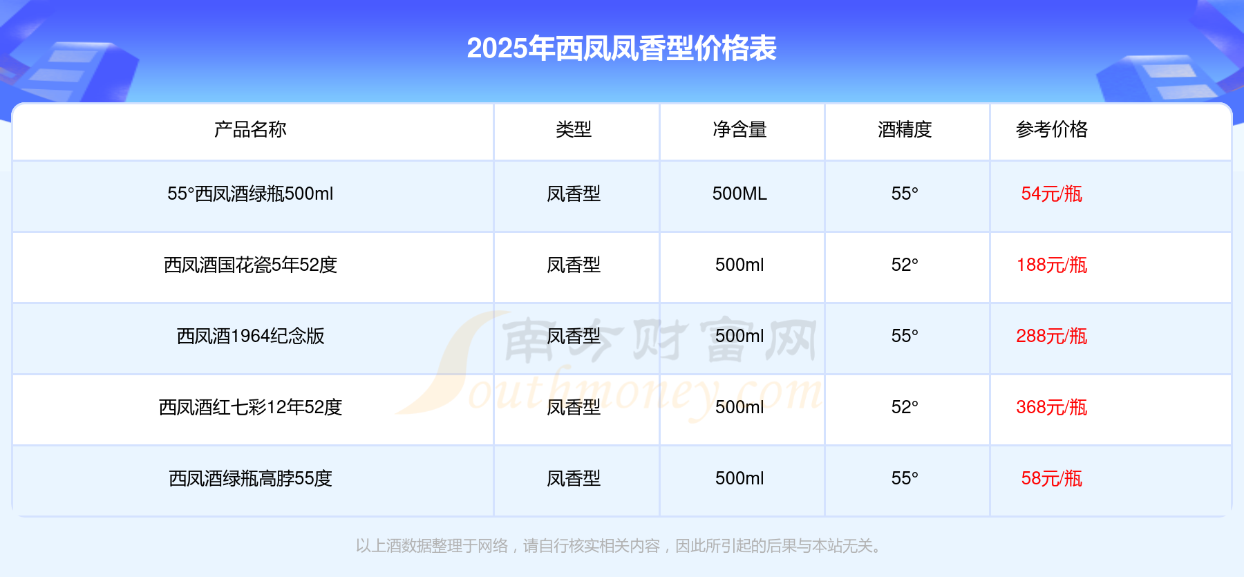 西鳳酒紅七彩12年52度參考價368元/瓶、西鳳酒1964紀念版參考價288元/瓶、西鳳酒國花瓷5年52度參考價188元/瓶、西鳳酒綠瓶高脖55度參考價58元/瓶、55°西鳳酒綠瓶500ml參考價54元/瓶。