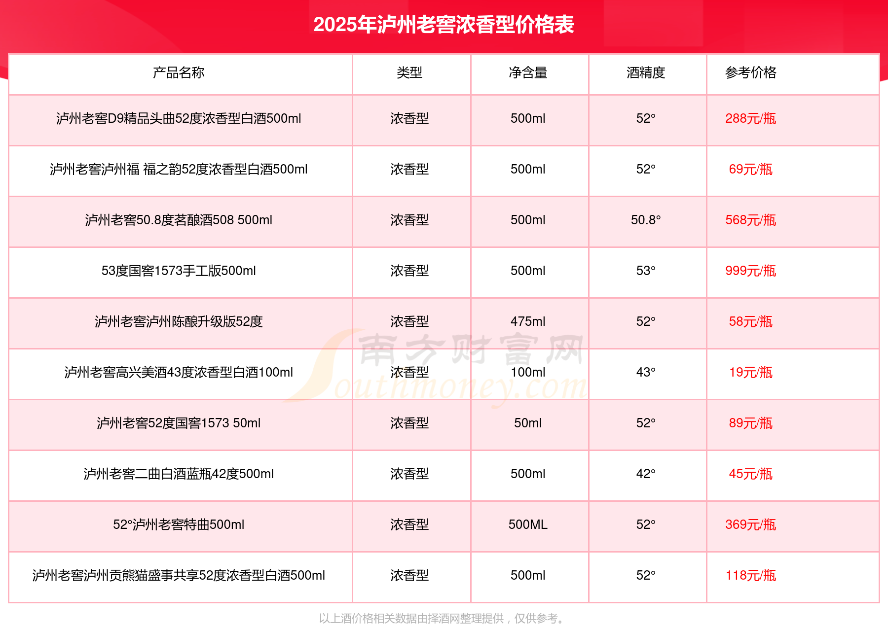 2025年,瀘州老窖濃香型酒價(jià)格最高的是瀘州老窖國(guó)窖1573春釀鼠兆豐年E 55度,參考價(jià)17999元,最低的是瀘州老窖45度五洲醉8窖經(jīng)典小酒版濃香型100ml,參考價(jià)10元,價(jià)格高低差為17989元。