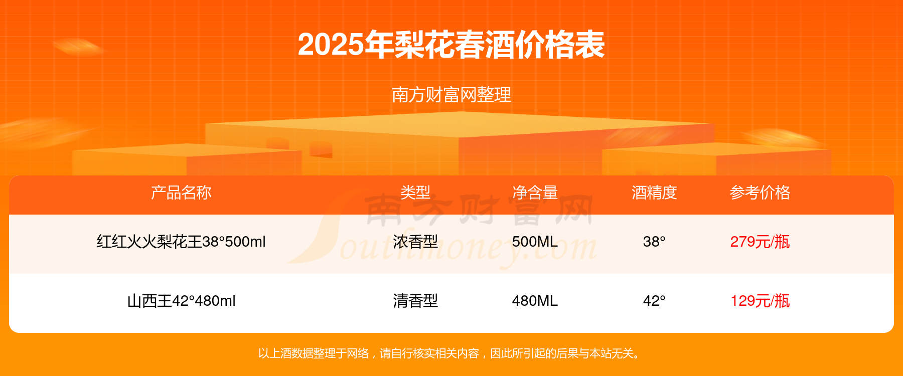 2025年,紅紅火火梨花王38°500ml、山西王42°480ml等梨花春酒參考價(jià)格如下:紅紅火火梨花王38°500ml參考價(jià)279元、山西王42°480ml參考價(jià)129元。