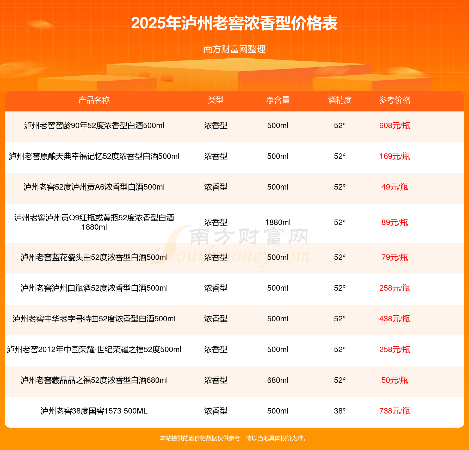 2025年瀘州老窖濃香型酒瀘州老窖國窖1573春釀鼠兆豐年E 55度、瀘州老窖國窖1573生命中的那壇酒55度014、瀘州老窖國窖1573春釀鼠兆豐年A 55度、瀘州老窖國窖1573生命中的那壇酒55度013濃香型白酒1000ml、瀘州老窖國窖1573生命中的那壇酒55度009 1000ml、瀘州老窖國窖1573中國品味52度濃香型白酒500ml、瀘州老窖國窖1573許燎源概念作品58度濃香型白酒1000ml等最新價格如下:瀘州老窖國窖1573春釀鼠兆豐年E 55度參考價17999元/瓶、瀘州老窖國窖1573生命中的那壇酒55度014參考價9999元/瓶、瀘州老窖國窖1573春釀鼠兆豐年A 55度參考價5088元/瓶、瀘州老窖國窖1573生命中的那壇酒55度013濃香型白酒1000ml參考價4988元/瓶、瀘州老窖國窖1573生命中的那壇酒55度009 1000ml參考價4288元/瓶、瀘州老窖國窖1573中國品味52度濃香型白酒500ml參考價2888元/瓶、瀘州老窖國窖1573許燎源概念作品58度濃香型白酒1000ml參考價2680元/瓶。