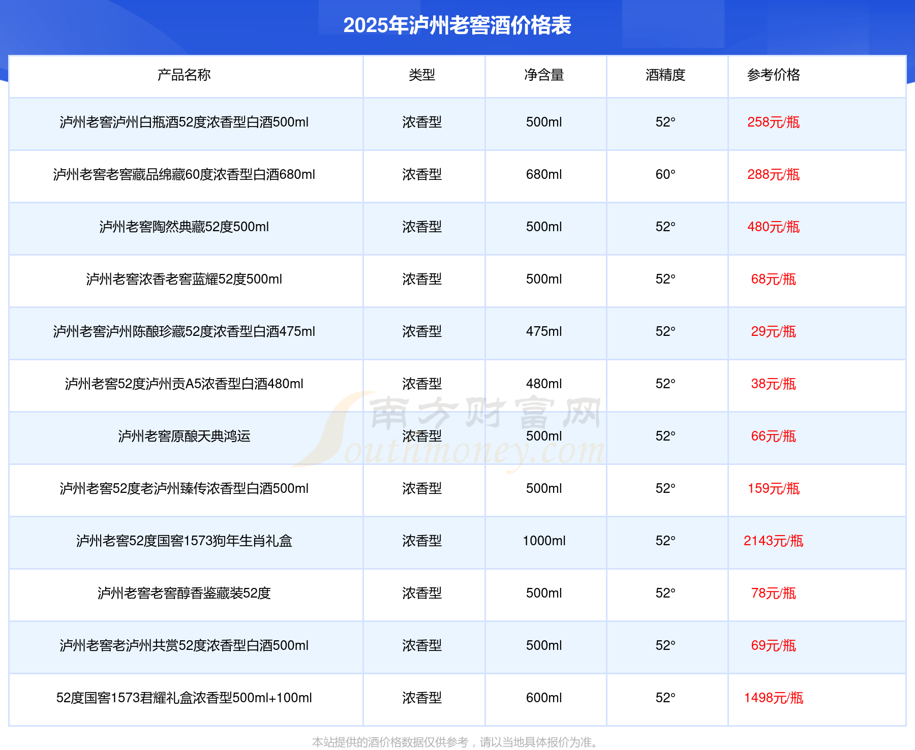 瀘州老窖國窖1573春釀鼠兆豐年E 55度參考價(jià)17999元/瓶、瀘州老窖國窖1573生命中的那壇酒55度014參考價(jià)9999元/瓶、瀘州老窖國窖1573春釀鼠兆豐年A 55度參考價(jià)5088元/瓶、瀘州老窖國窖1573生命中的那壇酒55度013濃香型白酒1000ml參考價(jià)4988元/瓶、瀘州老窖國窖1573生命中的那壇酒55度009 1000ml參考價(jià)4288元/瓶、瀘州老窖國窖1573中國品味52度濃香型白酒500ml參考價(jià)2888元/瓶。