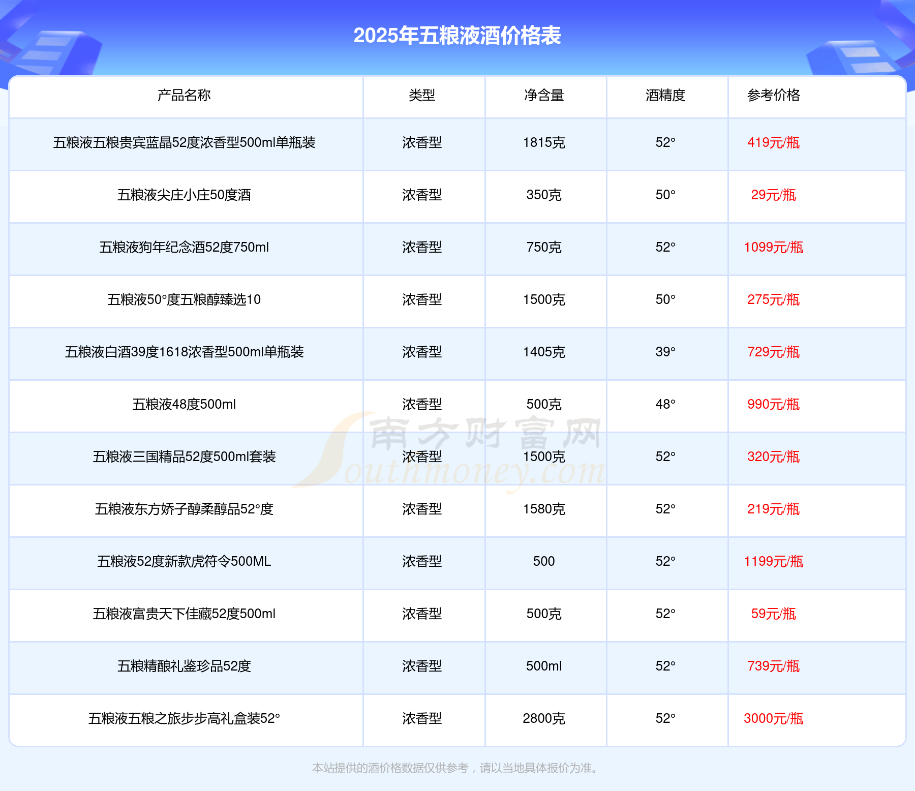 當(dāng)下五糧液酒價(jià)格最高的酒為五糧液百年世博世紀(jì)榮耀紀(jì)念酒60°999ml,參考價(jià)26980元/瓶,而五糧液酒價(jià)格最低的是五糧液干一杯小瓶46度,參考價(jià)16元/瓶,價(jià)格高低差為26964元/瓶。