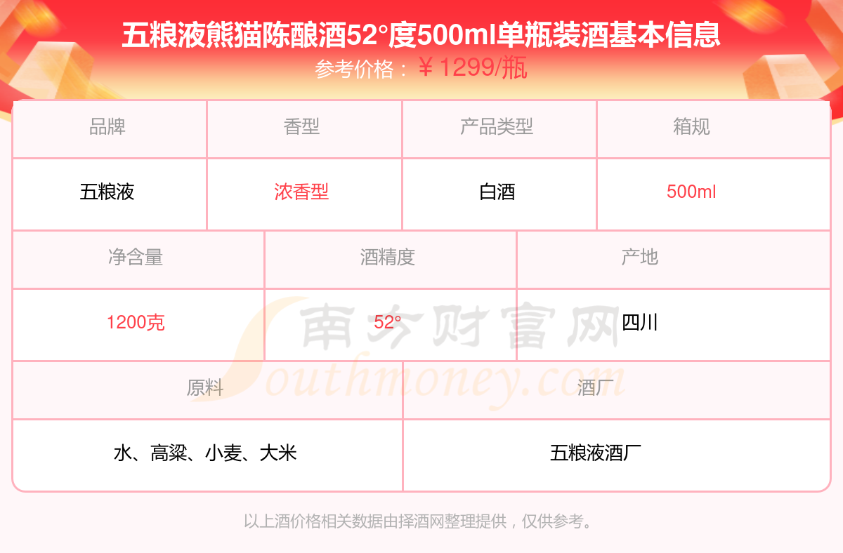 五糧液熊貓陳釀酒52°度500ml單瓶裝基本信息