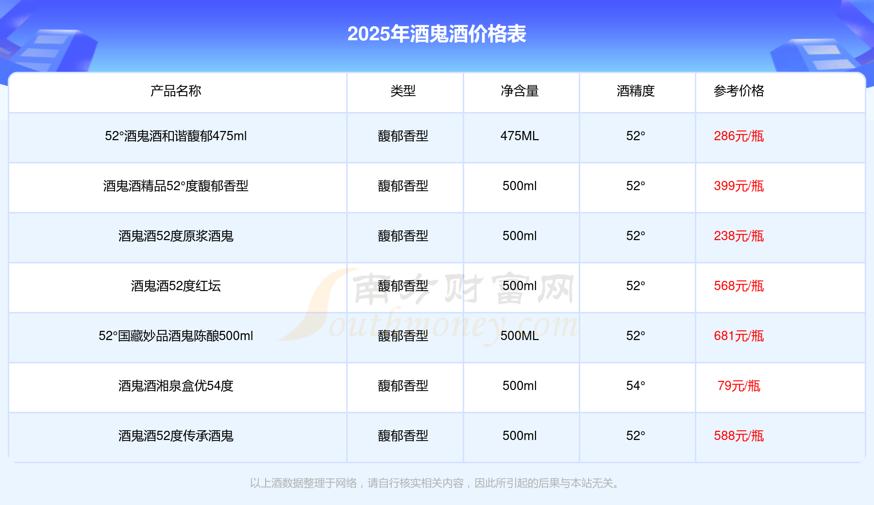 52°國藏妙品酒鬼陳釀500ml參考價681元/瓶、酒鬼酒52度傳承酒鬼參考價588元/瓶、酒鬼酒52度紅壇參考價568元/瓶、酒鬼酒精品52°度馥郁香型參考價399元/瓶、52°酒鬼酒和諧馥郁475ml參考價286元/瓶。