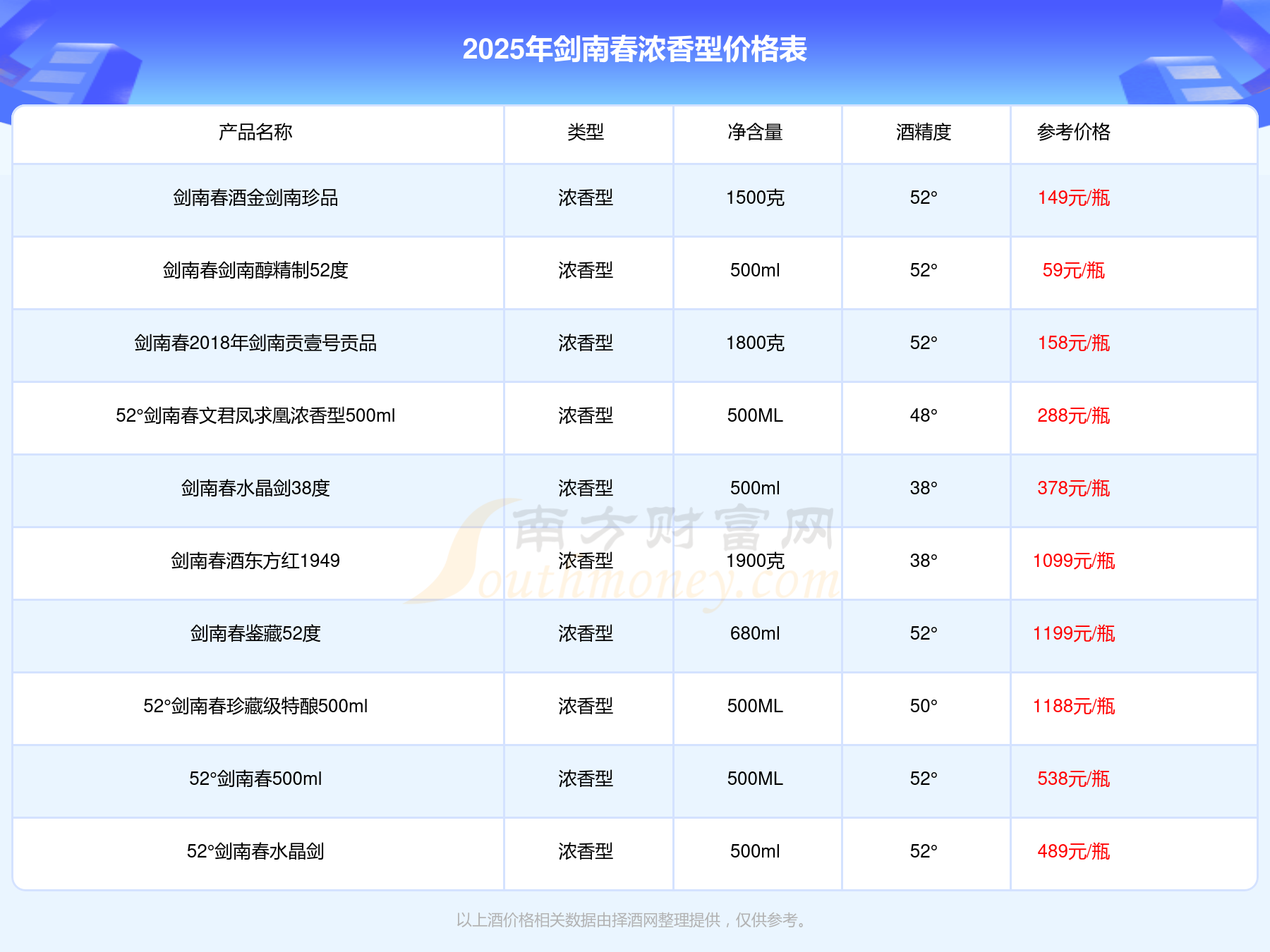 2025年,劍南春鑒藏52度、52°劍南春珍藏級(jí)特釀500ml、劍南春酒東方紅1949、52°劍南春500ml等劍南春濃香型酒價(jià)格如下: