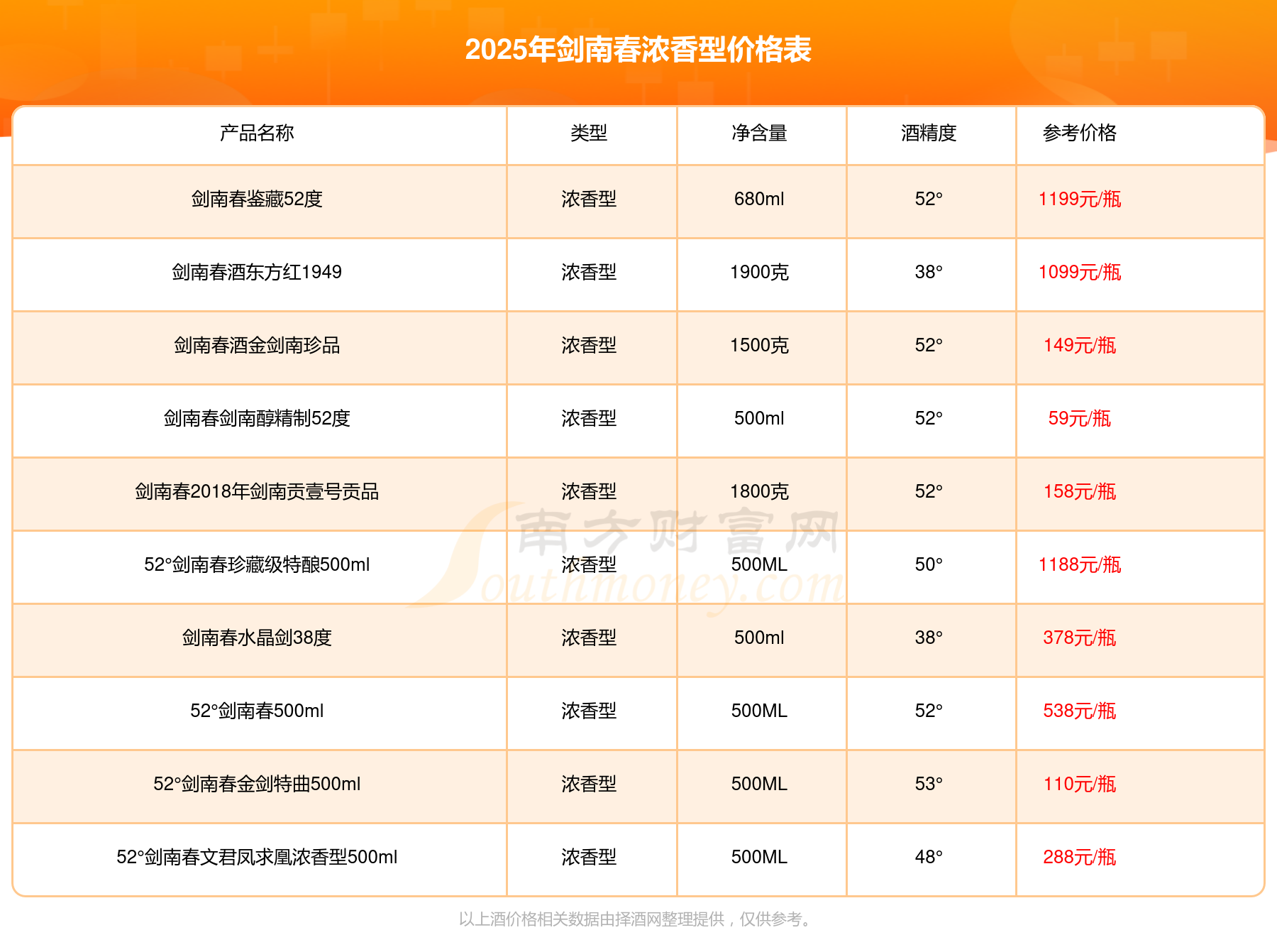 2025年劍南春濃香型酒劍南春鑒藏52度、52°劍南春珍藏級特釀500ml、劍南春酒東方紅1949、52°劍南春500ml、52°劍南春水晶劍等最新價(jià)格如下: