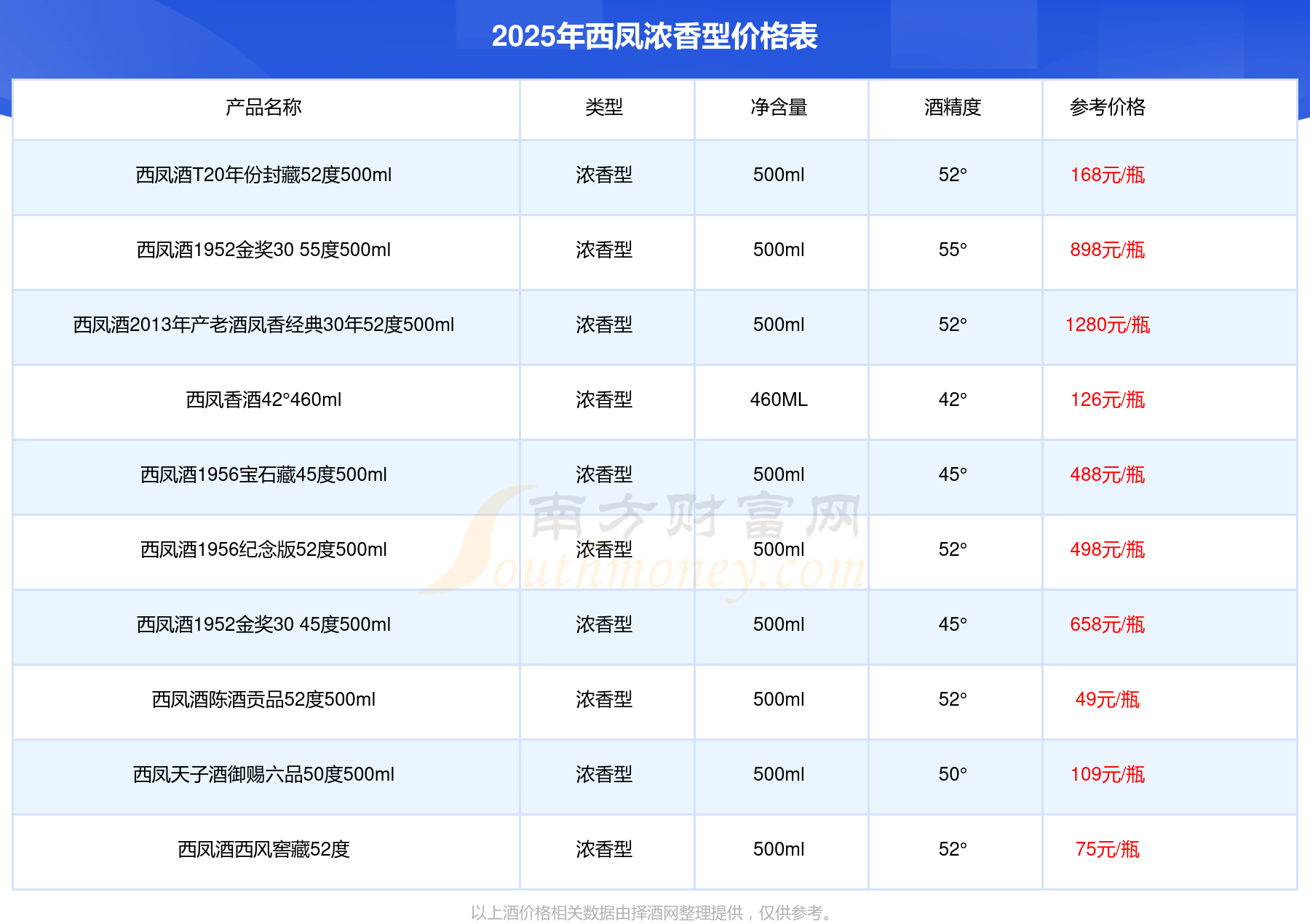 西鳳酒 酒海私藏55度3000ml參考價8880元/瓶、西鳳酒1952金獎50 55度500ml參考價2380元/瓶、西鳳酒2013年產(chǎn)老酒鳳香經(jīng)典30年52度500ml參考價1280元/瓶、西鳳酒1952金獎30 55度500ml參考價898元/瓶、西鳳酒鳳香經(jīng)典20年52度500ml參考價768元/瓶、西鳳酒1952金獎30 45度500ml參考價658元/瓶。