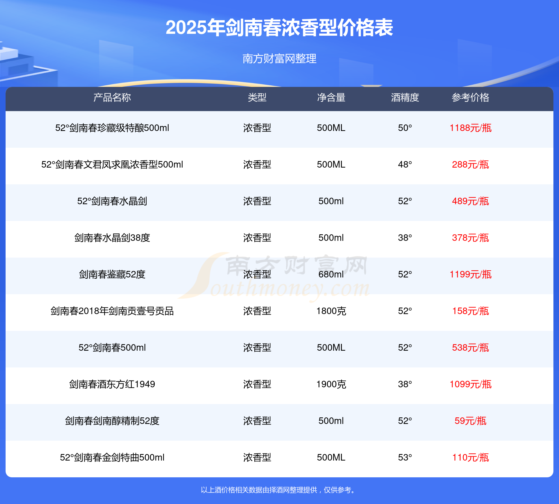 劍南春鑒藏52度參考價(jià)1199元/瓶、52°劍南春珍藏級(jí)特釀500ml參考價(jià)1188元/瓶、劍南春酒東方紅1949參考價(jià)1099元/瓶、52°劍南春500ml參考價(jià)538元/瓶、52°劍南春水晶劍參考價(jià)489元/瓶、劍南春水晶劍38度參考價(jià)378元/瓶、52°劍南春文君鳳求凰濃香型500ml參考價(jià)288元/瓶。