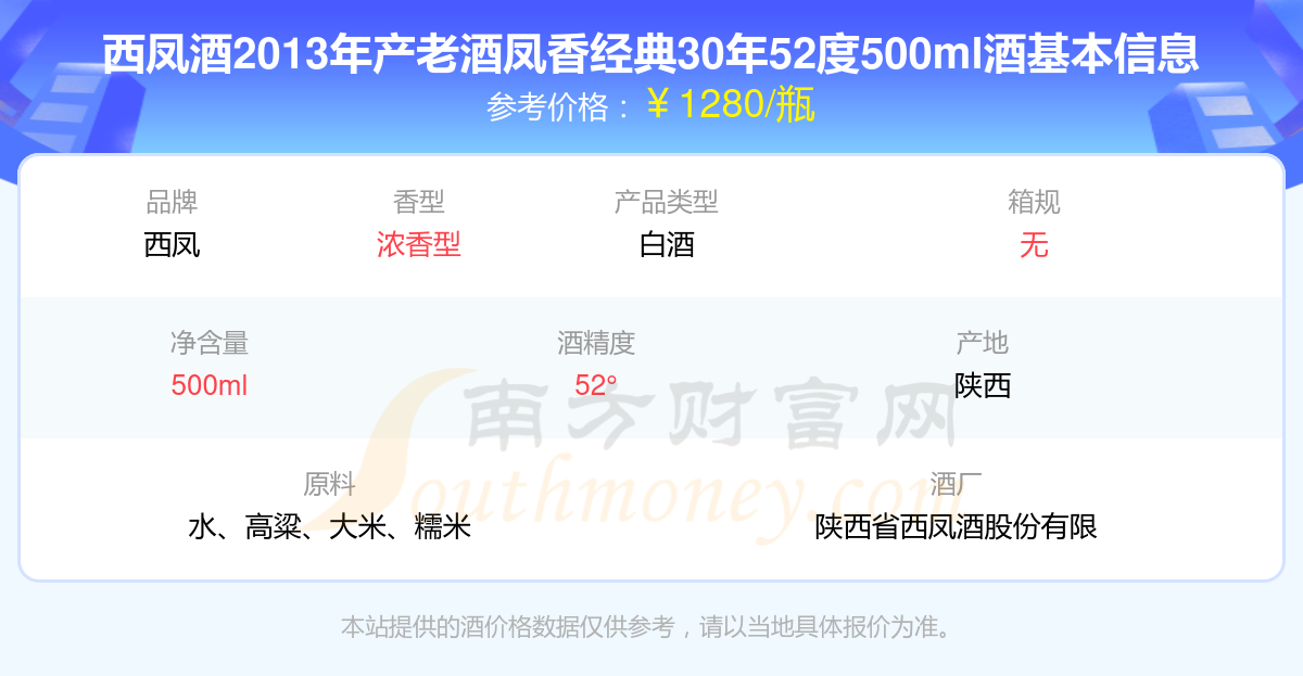 西鳳酒2013年產(chǎn)老酒鳳香經(jīng)典30年52度500ml基本信息
