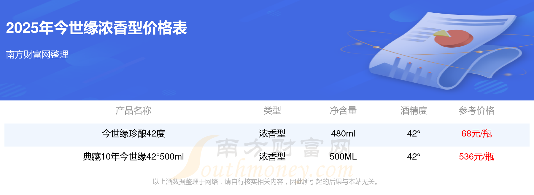 今世緣濃香型酒最新價(jià)格2025:典藏10年今世緣42°500ml參考價(jià)536元/瓶、今世緣珍釀42度參考價(jià)68元/瓶。