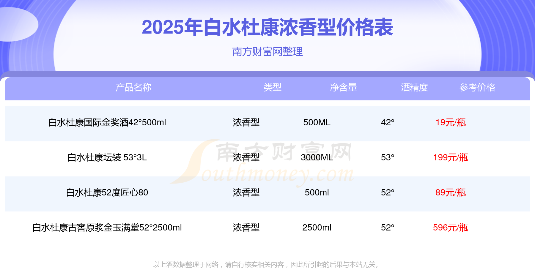 白水杜康古窖原漿金玉滿堂52°2500ml參考價(jià)596元/瓶、白水杜康壇裝 53°3L參考價(jià)199元/瓶、白水杜康52度匠心80參考價(jià)89元/瓶。