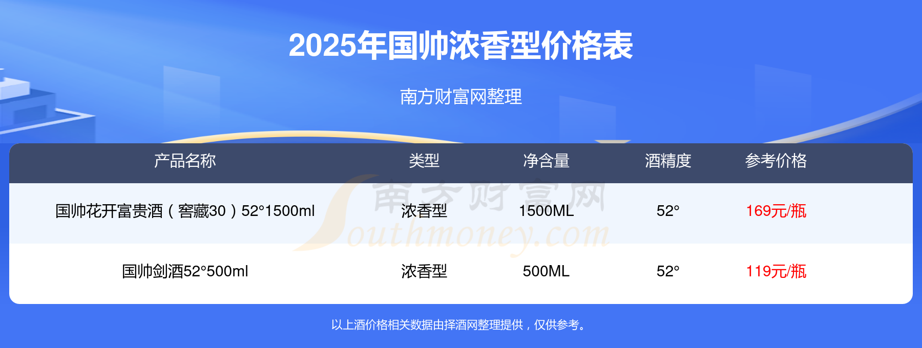 當(dāng)前國帥濃香型酒價(jià)格最高的酒為國帥花開富貴酒(窖藏30)52°1500ml,參考價(jià)169元/瓶,而國帥濃香型酒價(jià)格最低的是國帥劍酒52°500ml,參考價(jià)119元/瓶,價(jià)格高低差為50元/瓶。