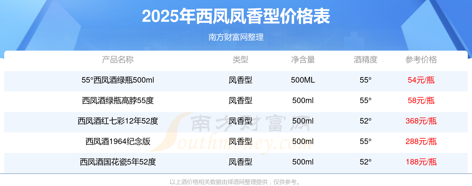2025年,西鳳酒紅七彩12年52度、西鳳酒1964紀(jì)念版、西鳳酒國花瓷5年52度、西鳳酒綠瓶高脖55度等西鳳鳳香型酒價格如下:西鳳酒紅七彩12年52度參考價368元/瓶、西鳳酒1964紀(jì)念版參考價288元/瓶、西鳳酒國花瓷5年52度參考價188元/瓶、西鳳酒綠瓶高脖55度參考價58元/瓶。