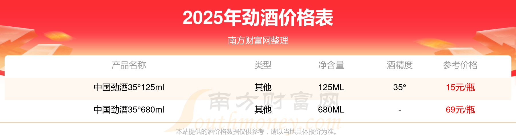 2025年,中國勁酒35°680ml、中國勁酒35°125ml等勁酒價格如下:中國勁酒35°680ml參考價69元/瓶、中國勁酒35°125ml參考價15元/瓶。