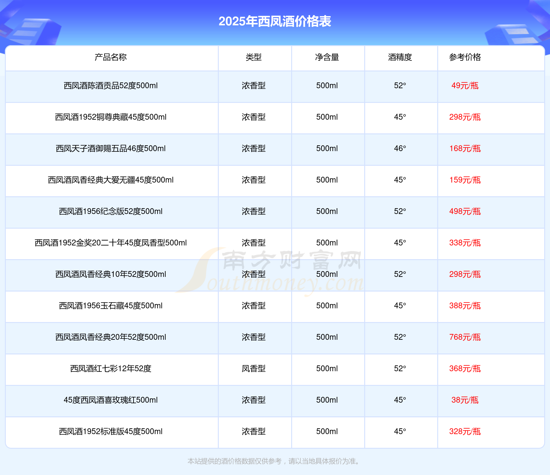 2025年西鳳酒西鳳酒 酒海私藏55度3000ml、西鳳酒1952金獎(jiǎng)50 55度500ml、西鳳酒2013年產(chǎn)老酒鳳香經(jīng)典30年52度500ml、西鳳酒1956鉆石藏45度500ml、西鳳酒1952金獎(jiǎng)30 55度500ml、西鳳酒鳳香經(jīng)典20年52度500ml、西鳳酒1952金獎(jiǎng)30 45度500ml等最新價(jià)格如下:西鳳酒 酒海私藏55度3000ml參考價(jià)8880元/瓶、西鳳酒1952金獎(jiǎng)50 55度500ml參考價(jià)2380元/瓶、西鳳酒2013年產(chǎn)老酒鳳香經(jīng)典30年52度500ml參考價(jià)1280元/瓶、西鳳酒1956鉆石藏45度500ml參考價(jià)980元/瓶、西鳳酒1952金獎(jiǎng)30 55度500ml參考價(jià)898元/瓶、西鳳酒鳳香經(jīng)典20年52度500ml參考價(jià)768元/瓶、西鳳酒1952金獎(jiǎng)30 45度500ml參考價(jià)658元/瓶。