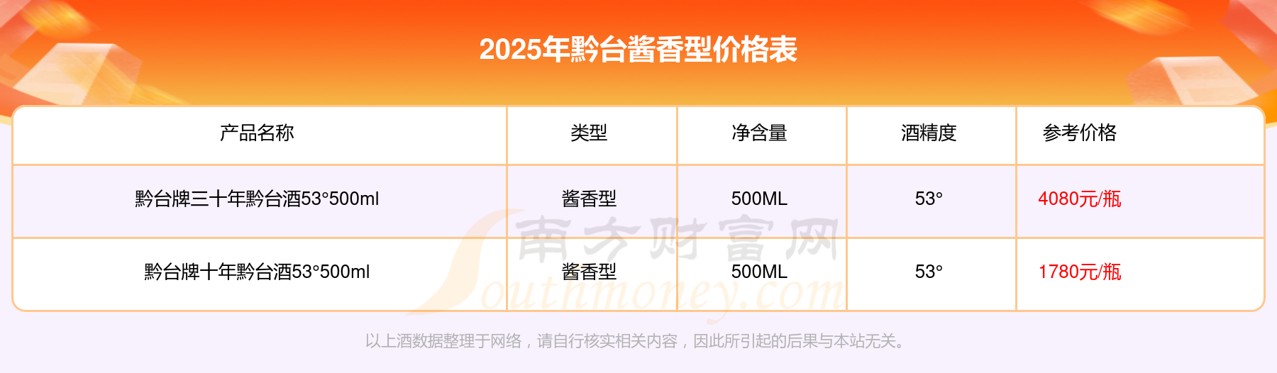 黔臺牌三十年黔臺酒53°500ml參考價4080元/瓶、黔臺牌十年黔臺酒53°500ml參考價1780元/瓶。