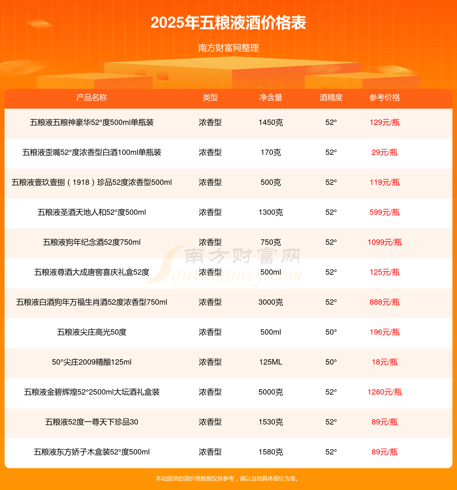 2025年五糧液價格最高的酒是五糧液百年世博世紀(jì)榮耀紀(jì)念酒60°999ml,參考價26980元/瓶,最低的是五糧液干一杯小瓶46度,參考價16元/瓶,價格高低差為26964元/瓶。