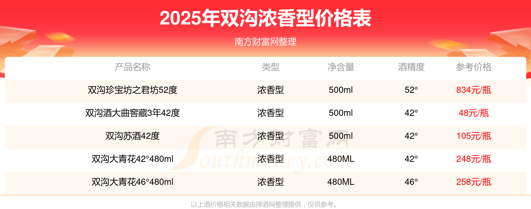 2025雙溝濃香型酒最新價(jià)格:雙溝珍寶坊之君坊52度參考價(jià)834元/瓶、雙溝大青花46°480ml參考價(jià)258元/瓶、雙溝大青花42°480ml參考價(jià)248元/瓶、雙溝蘇酒42度參考價(jià)105元/瓶、雙溝酒大曲窖藏3年42度參考價(jià)48元/瓶。