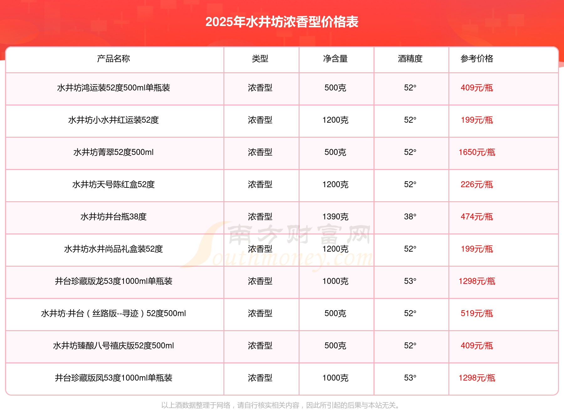 2025水井坊濃香型酒最新價(jià)格:水井坊大壇收藏級(jí)原漿天球瓶66度參考價(jià)13999元/瓶、水井坊博物館壹號(hào)53度雙瓶裝參考價(jià)10988元/瓶、53°水井坊公元十三600ml參考價(jià)2580元/瓶。